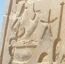 - ↑ Sonderzeichen U 103 gemäß Petra Vomberg: Sonderzeichenliste In: Rainer Hannig: Großes Handwörterbuch Ägyptisch-Deutsch : (2800 - 950 v. Chr.). von Zabern, Mainz 2006, ISBN 3-8053-1771-9, S. 1448.