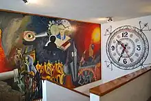 The Museo de Relojería Alberto Olvera Hernández or Alberto Olvera Hernández Clock Museum was founded in 1993 and named after the founder of Centenario Clocks. It contains replica and original timepieces to demonstrate methods of measuring time over history. These include sundials used 2000 BCE, candle “clocks” with markings for hours, and similar timepieces but with oil lamps. There are numerous examples of mechanical clocks.[6] One unique piece is a clock statue of Merlin the magician, whose arms point to the time but only for twelve hours a day. During the night hours, his arms “rest.” Entrance to the factory and museum is free.[7] The museum is reached by walking through the factory, which is open to visitors, who can see all the processes from the smelting of metal to the final test of the completed piece.[6] The museum is connected to the factory floor by a stairwell which has a mural. This mural depicts the relevant life events of Alberto Olvera Hernandez. Olvera Hernandez appears in the center of a ring of icons related to time, and books related to his self training as well as a profile of his wife, Maria Charolet. Below are twelve figures representing his twelve children and well as the violin and mandolin which he played.[8]