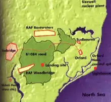 ![]() Fence at the site of the former East Gate of RAF Woodbridge, where the incident began in December, 1980. The original East Gate was much smaller.[1] | |
