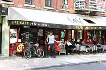Many actual locations and events are included in, or are the inspiration for, elements of the musical. Life Café, where the "La Vie Bohème" numbers are set, was an actual restaurant (closed 2013) on 10th Street and Avenue B in the East Village of New York City.[15][16] The riot at the end of the first act is based on the East Village riot in 1988 that arose as a result of the city-imposed curfew in Tompkins Square Park.[16]