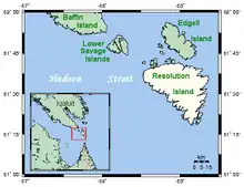 Resolution Island is one of the many uninhabited Canadian Arctic islands in Qikiqtaaluk Region, Nunavut. It is a Baffin Island offshore island located in Davis Strait. It has an area of 1,015 km2 (392 sq mi).[3] The Lower Savage Islands lie between Resolution Island and Baffin Island, while Graves Strait separates Resolution Island from the more northern Edgell Island.