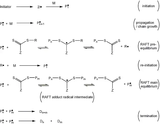 RAFT is a type of living polymerization involving a conventional radical polymerization which is mediated by a RAFT agent.[8] Monomers must be capable of radical polymerization.[9] There are a number of steps in a RAFT polymerization: initiation, pre-equilibrium, re-initiation, main equilibrium, propagation and termination.