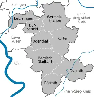 The Rheinisch-Bergische Kreis is a Kreis (district) in the Cologne Bonn Region of North Rhine-Westphalia, Germany. Neighboring districts are Kreis Mettman, Oberbergischer Kreis and Rhein-Sieg, and the district-free cities Cologne, Leverkusen, Solingen and Remscheid.