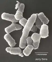 Rhodococcus is a genus of aerobic, nonsporulating, nonmotile Gram-positive bacteria closely related to Mycobacterium and Corynebacterium.[2][3] While a few species are pathogenic, most are benign, and have been found to thrive in a broad range of environments, including soil, water, and eukaryotic cells. Some species have large genomes, including the 9.7 megabasepair genome (67% G/C) of Rhodococcus sp. RHA1.[4]
