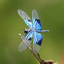 Rhyothemis resplendens, common name Jewel flutterer,[3] is a species of dragonfly in the family Libellulidae.[4] The genus Rhyothemis extends from Africa to the western Pacific, with five species known in Australia. The species Rhyothemis resplendens has blue metallic reflecting panels on both wing sets, and inhabits streams, rivers and still waters on and adjacent to coastal Queensland, from around Mackay to the northern part of Cape York Peninsula. It is a small dragonfly with a wingspan of 40-60mm and body length around 25mm. To the north of Australia it is found in the Moluccas, New Guinea and the Bismarck Archipelago.[3][5] On the adult, markings on the hindwing are longer than those on the forewing.[3] The taxon has been assessed for the IUCN Red List as being of least concern.