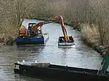 Since it was opened, the Ribble Link had been expensive to maintain. It suffered from flooding during the winter of 2003-2004, resulting in a lot of material being depositied in the channel, and scouring of some of the bywash weirs. The link was closed and Land and Water were employed to carry out dredging in March 2004. This was hampered by low water levels due to damage to the bywash weirs and by water supplies being limited by other work taking place on the Lancaster Canal. The whole of the link needed to be dredged, and further flooding took place while the work was in progress. The cost of the operation was £124,576.[43] The link was closed again during 2006, after voids appeared behind some of the lock structures. The work to fill the voids and to repair a lock bywash cost £360,000. Further dredging was required and cost £240,000. Some of this was achieved by conventional bucket dredging, where the material was removed and taken to landfill, but the use of 'cutter section' dredging was also trialled, after a licence was obtained from the Department for Environment, Food and Rural Affairs (DEFRA). This involved pumping the silt over the sea lock gate when the tide was going out so that it was carried into the Ribble, and following completion of the work, the link was re-opened on 6 April 2007. The effectiveness of cutter section dredging resulted in British Waterways applying for annual licences for the process. Sludge is brought into the lower section of the link by incoming tides,[44] and is a known problem on the Ribble. The cost of dredging to maintain the route to Preston Docks was one of the main reasons why they were closed in October 1981.[45]