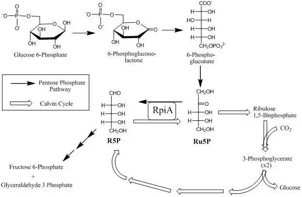 Ribose-5-phosphate isomerase (Rpi) encoded by the RPIA gene is an enzyme (EC 5.3.1.6) that catalyzes the conversion between ribose-5-phosphate (R5P) and ribulose-5-phosphate (Ru5P). It is a member of a larger class of isomerases which catalyze the interconversion of chemical isomers (in this case structural isomers of pentose). It plays a vital role in biochemical metabolism in both the pentose phosphate pathway and the Calvin cycle. The systematic name of this enzyme class is D-ribose-5-phosphate aldose-ketose-isomerase.