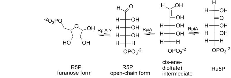 In the reaction, the overall consequence is the movement of a carbonyl group from carbon number 1 to carbon number 2; this is achieved by the reaction going through an enediol intermediate (Figure 1).[6] Through site-directed mutagenesis, Asp87 of spinach RpiA was suggested to play the role of a general base in the interconversion of R5P to Ru5P.[7]