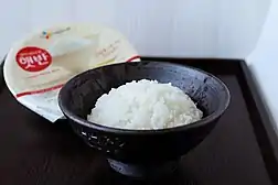 Milled rice cooked with water by boiling, steaming, and braising. Rice can be flavoured by adding vegetables, meat, fish, and legumes. Rice porridge is a popular dish for individuals with health issues and children, as it is easy to digest.[10]