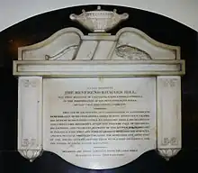 Richard Hill died on duty in the vestry of St James, reportedly of apoplexy. A tombstone commemorating him is at Camperdown.[2][3] His sudden death shocked his contemporaries and inspired earnest original poetry in tribute to his memory. At least two multi-stanza original poems were published in the Sydney press, one of which self-consciously referenced a recent poem by Lord Byron by beginning with "There was a sound of revelry by night", borrowed from Childe Harold (Canto the Third, Stanza XXI), and attempting to copy that poem's versification throughout. The poem in tribute to Hill revealed his reputation in the lines at the end of its Stanza III: "... he did most kindly feel For all others' woes, and laboured for their weal."[9][10]