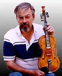 Robert "Bud" Larsen with a Hardanger fiddle he has made in the Gunnar Gunnarsson Helland style.