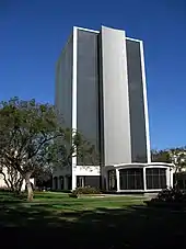 On the Caltech campus, several physical features, rooms, awards, and a professorship were named in honor of Millikan, including the Millikan Library, which was completed in 1966. In January 2021, the board of trustees voted to immediately strip Millikan's name from the Caltech campus because of his association with eugenics. The Robert A. Millikan Library has been renamed Caltech Hall.[43] In November 2021, the Robert A. Millikan Professorship was renamed the Judge Shirley Hufstedler Professorship.[44]