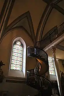 The staircase and stained glass windows at the Loretto Chapel