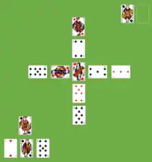 The ♠J is the base card of the single foundation which must be built on in descending sequence, regardless of suit, with Kings following Aces. The outermost cards of the cross are available for play to the foundation. As soon as one is moved to the foundation, its place is taken by the top card of the reserve guard. Once the latter is exhausted, the outer cards are not replaced and an inner card becomes available once the corresponding outer card has gone.[3]