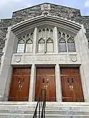 Arches: The entrance doors to the gymnasium are under one pointed arch. There are also six windows with a similar shape above the main doors.