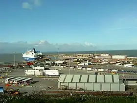 Rosslare Europort (Irish: Europort Ros Láir) is a modern seaport located at Rosslare Harbour in County Wexford, Ireland, near the southeasternmost point of the island of Ireland. The port is the premier Irish port serving the European Continent with 36 direct services to the Continent weekly.[4] It handles passenger and freight ferries to and from Cherbourg, Dunkirk and St Malo/Roscoff, in France, Bilbao in Spain and Fishguard and Pembroke Dock in the United Kingdom. Since July 2022, a new freight route between Rosslare and Zeebrugge, Belgium was introduced by Finnlines (Grimaldi Group) for a twice weekly ro-ro service between the two ports.