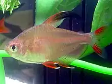 The rosy tetra (Hyphessobrycon rosaceus) is a small species of Characin from the South American countries of Guyana and Suriname.[1] It is popular in the aquarium trade.