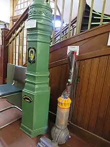 The tram depot in Port Bannatyne, which used to hold 20 trams, is now in use as a bus garage,[13] and there are still tramway rails embedded in the floor.[14] The depot consists of single storey red brick sheds with arcaded bays. A narrow building in front of the garage houses the enquiry office for the bus company. It was constructed in the early 20th century as part of the tramway development, and is a category C listed building, although the depot is not listed.[15] Around 1 mile (1.6 km) of the reserved trackbed has been reused as a footpath[16] and also forms part of the West Island Way long distance footpath.[17] Rothesay Museum have three artefacts from the tramway. The handle used to operate the controller of the final tram to run on the system is displayed in a glass case. They also have the cast metal base for one of the overhead line poles, and a replica seat from a toastrack car. The cast iron ends are original, and although the woodwork is newer, its maker used the original specifications to ensure its accuracy.[18]