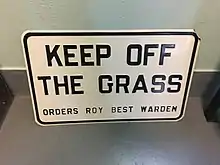A sign, made in the Colorado Territorial Correctional Facility's sign shop, lists Roy Best as Warden.