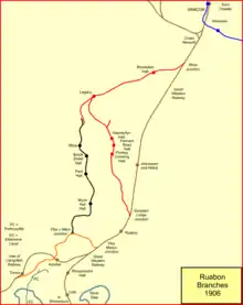 The GWR later obtained authorisation to construct a branch line (the "Rhos" branch) from a junction south of Wrexham to Legacy, making new connections there with the Ponkey branch and the Plas Madoc branch.[15] This new group of branches opened on 1 October 1901.[13][14]