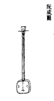 Ruan may have a history of over 2,000 years, the earliest form may be the qin pipa (秦琵琶), which was then developed into ruanxian (named after Ruan Xian, 阮咸), shortened to ruan (阮).[1][2] In old Chinese texts from the Han to the Tang dynasty, the term pipa was used as a generic term for a number plucked chordophones, including ruan, therefore does not necessarily mean the same as the modern usage of pipa which refers only to the pear-shaped instrument. According to the Pipa Annals 《琵琶赋》 by Fu Xuan (傅玄) of the Western Jin dynasty, the pipa was designed after revision of other Chinese plucked string instruments of the day such as the Chinese zither, zheng (筝) and zhu (筑), or konghou (箜篌), the Chinese harp.[3] However, it is believed that ruan may have been descended from an instrument called xiantao (弦鼗) which was constructed by labourers on the Great Wall of China during the late Qin dynasty (hence the name Qin pipa) using strings stretched over a pellet drum.[4]
