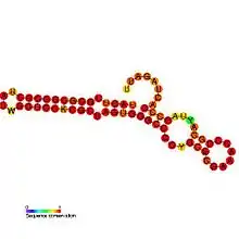 The Rubella virus 3′ cis-acting element RNA family represents a cis-acting element found at the 3′ UTR in the rubella virus. This family contains three conserved step loop structures.[1] Calreticulin (CAL), which is known to bind calcium in most eukaryotic cells, is able to specifically bind to the first stem loop of this RNA.[1] CAL binding is thought to be related to viral pathogenesis and in particular arthritis which occurs frequently in rubella infections in adults and is independent of viral viability. All stem loop structures are thought to be important for efficient viral replication and deletion of stem loop three is known to be lethal.[1]