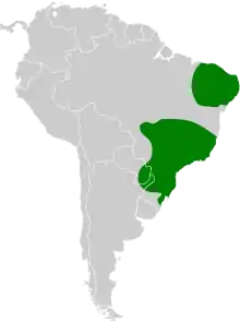 The nominate subspecies of the rufous-breasted leaftosser is found from central Brazil's Mato Grosso, Goiás, and Minas Gerais states south into Rio Grande do Sul and through eastern Paraguay into northeastern Argentina's Misiones Province. It mostly inhabits lowland tropical rainforest and montane evergreen forest, and also occurs in mature secondary forest. In elevation it ranges from near sea level to 1,600 m (5,200 ft).[6]