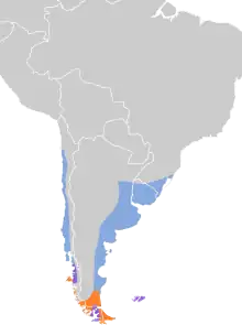 The rufous-chested dotterel is found on the Falkland Islands and coastally to somewhat inland in Argentina, Uruguay, extreme southeastern Brazil, and Chile.[7] It has also been recorded as a vagrant in Paraguay and Peru.[5] In the breeding season it primarily inhabits short grasslands away from the coast but also boggy or stony areas around inland lakes and coastal shingle. Outside the breeding season it inhabits inland eroded and flooded grasslands, marshes, and streams, and also coastal mudflats, beaches, and rocky shores.[7]