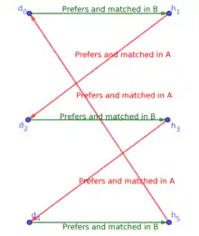 Similarly, since matching B is stable, d2 prefers its hospital in B over h1; denote this hospital by h3, and denote the prefererence by a green arrow from d2 to h3.