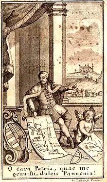 In the literature, Mikoviny is mentioned as a Slovak polymath (the first Slovak engineer)[3][4][5][6] and also as a Hungarian.[7][8] The contemporary elites identified themselves as members of common Natio Hungarica regardless of their ethnic origin, whereas the contemporary term Hungarus is an umbrella term covering ethnic Hungarians (Magyars), Slovaks and other ethnic groups in the Kingdom of Hungary because the self-definition through a common homeland, class or religion was more common than through language. The Slovak origin of Mikoviny was noticed already by Ján Kollár and is supported by further research in present-day Slovakia. Besides another, the research in local archives confirmed that the father of Sámuel Mikoviny wrote his records in Turicska in Slovak.[3] Mikoviny declared himself in more of his maps and works as "nobilis Hungarus".[9][10] Two letters written in Hungarian remained after him,[11][10] however - as per the contemporary customs - by his studies and works mostly he used the German and the Latin language.[10]