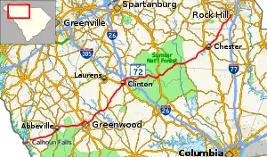Leaving Greenwood, the route heads towards Clinton where it intersects with I-26. Passing the interstate, the route enters into the Sumter National Forest and passes through the small town of Whitmire. From Whitmire until just shy of its eastern terminus, SC 72 is cosigned with SC 121. The route exits the Sumter National Forest and bypasses Chester to the south. Once past Chester, the route turns more towards the north as it enters Rock Hill, where it terminates at SC 122 in the downtown area.[8]