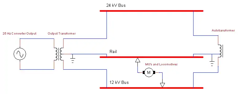Power is transmitted, effectively, at 36 kV because the 24 kV and 12 kV components are 180° out of phase. This design has several advantages over the PRR's more traditional transmission and distribution scheme. The highest voltage, with respect to ground, within the system is 24 kV. This is significantly less than the 69 kV seen in the PRR's system, which required much larger 80 feet (24 m) towers and larger insulators and transformers. On a small system such as the Reading's, transmission infrastructure of this scale was unnecessary. Secondly, the system uses the 12 kV catenary wire for both transmission and distribution. This dual use of the catenary wire allows performing both functions with only two wires. The PRR's system in contrast required three wires: two for the single phase 138 kV transmission component and one for the 12 kV catenary feeder. In both systems, the rail is used as a return path for traction current.