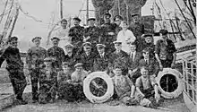 It was reported that at the time of departure, whilst the weather was blustery, it was not sufficient for Capt. Hill to decide against making passage.[23] The Fenella departed Liverpool on time and, exiting the Victoria Channel, she passed the Bar Light Ship, whereupon she set a course for Douglas. As the Fenella cleared to the northwest of Liverpool Bay, the weather worsened, and what was reported to be "one of the worst storms in many years" developed, with the wind blowing from the northwest, creating associated sleet and hail squalls.[23] Reports stated that passengers on the deck were advised by the ship’s crew to go below due to the severity of the weather, but several passengers declined to do this, some seeking shelter on a covered seat aft of the funnel. According to a witness, Mr. Tom Wood, two passengers returned to the deck, (Mr. John Mc Combe and a young woman, Miss Janie Clucas), who joined three men believed to be the victims, sitting on the covered seat. Wood then stated that a wave crashed over the port beam of the Fenella with such force that it swept away the seat, dispersing its occupants, with the result that Mc Combe and Miss Clucas were washed up opposite the saloon door.[23] Having both sustained injuries, they were taken into the saloon, where treatment was administered, and they stayed in the saloon for the remainder of the voyage.