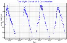 S Cassiopeiae is a variable Mira, a pulsating variable star whose visual brightness varies over several magnitudes with a somewhat regular period and amplitude. Its visual magnitude varies between +7.9 and +16.1 over an average period of 612.43 days. Mira variables are stars in the last stages of evolution whose instability comes from pulsations in their surfaces, causing changes in color and brightness. Some of them, including S Cassiopeiae show SiO maser emission.[11]