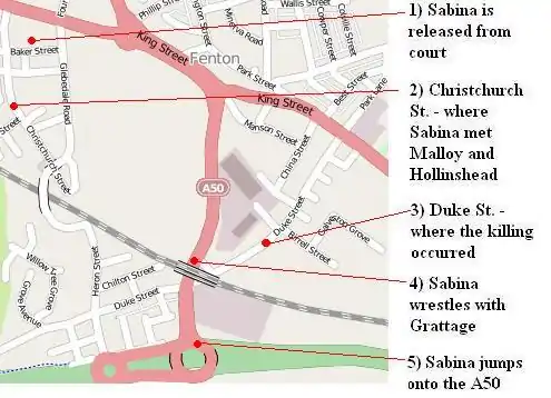 Leaving court, Sabina began to wander the streets of Stoke-on-Trent, trying to locate her sister in hospital, and carrying her possessions in a clear plastic bag given to her by police.[14] She was also wearing her sister's green top.[12] At 7:00 pm, two local men spotted Sabina while walking their dog on Christchurch Street, Fenton.[7][1] One of the men was 54-year-old Glenn Hollinshead, a self-employed welder, qualified paramedic, and former RAF airman,[15] and the other was his friend, Peter Molloy. Sabina appeared friendly and stroked the dog as the three struck up a conversation.[14] Although friendly, Sabina appeared to be behaving nervously, which worried Molloy.[14] Sabina asked the two men for directions to any nearby bed and breakfasts or hotels.[1]