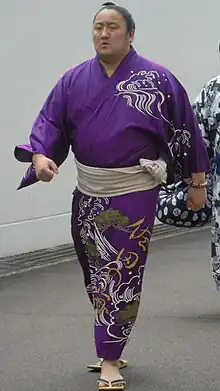 He first fought all the top wrestlers ranked at maegashira #2 in the March 2015 tournament and posted a respectable 7–8 score that kept him ranked high enough to face all the top competition in the following tournament, where he scored his first kinboshi for defeating a yokozuna Harumafuji[10] and posted a winning record of 8–7, also beating the eventual tournament champion, Terunofuji. He was nominated for the Outstanding Performance Prize, normally given to those who beat the tournament champion or a yokozuna and manage a winning record, but there was opposition since he posted a bare minimum winning record with one win by default and the prize was not awarded.[11] Nonetheless he was promoted to his highest rank to date of maegashira 1 for the July 2015 tournament. Since then his results have been disappointing and he slid down the maegashira ranks with seven consecutive make-koshi or losing scores from July 2015 to July 2016. He was able to get a winning record in September 2016 with an 8–7, however he got another losing record in the November 2016 tournament, scoring only 3–12 which was his worst record to date in the top division. He was demoted to the jūryō division after the March 2017 tournament, breaking a run of 18 straight tournaments at a maegashira rank, the longest amongst active wrestlers. However, a 9–6 record at the rank of Jūryō 1 East was enough for an immediate return to the top division. He missed the first five days of the September 2017 tournament because of an injury to his right leg,[12] and although he entered from Day 6, he could not prevent demotion to jūryō. In March 2018 he won the jūryō division championship with an 11–4 record, beating Akiseyama in a playoff, to ensure his return to makuuchi. Upon reaching his thirties, Sadanoumi began to consult doctors and specialists to condition his body to fight as long as possible, he himself wanting to fight until 40 years old.[1] Despite never rising higher than maegashira 8 he remained in the top division until January 2021. After four tournaments in jūryō he returned to makuuchi in November 2021.[13] In May 2022 he scored eleven wins against four losses to share runner-up honours alongside Takanoshō and Daieishō, and received his second Fighting Spirit Prize and first since 2014.[14] In November 2022, Sadanoumi won his match against Ōzeki Shōdai. This match was the first time in three years that the two Kumamoto natives faced each other.[15]