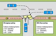 However, the implications for road safety of cycle tracks at intersections is disputed. Studies generally show an increase in collisions at junctions, especially where cyclists are travelling in the direction opposite to the flow of traffic (e.g. on two-way cycle tracks). Protected intersection designs generally improve safety records over non-protected junction types.[1][8]