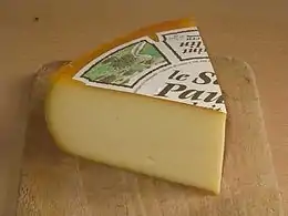 Saint Paulin is a creamy, mild, semi-soft French cheese made from pasteurized cow's milk, originally made by Trappist monks at Saint Paulin.[1][2] It is a buttery cheese, but firm enough for slicing. Saint Paulin is similar to Havarti and Esrom, and is suited to serving as a table or dessert cheese; it is often served with fruit and light wine. Genuine Saint Paulin has an edible yellow-orange rind. It is ripened in a round loaf with slightly protruding sides, and matures in about four weeks.