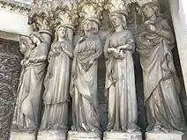 Burges's designs for the western façade were based on medieval French iconography. He considered this front to be the most important exterior feature, as it would be lit by the setting sun and thus the most dramatic.[47] The theme is The Last Judgement, with representations of the twelve Apostles bearing instruments of their martyrdom, the Wise and the Foolish Virgins, the Resurrection of the Dead and the Beasts of The Evangelists.[48] The gilded copper "resurrection angel" facing eastward on the main spire is locally the cathedral's most iconic feature, and colloquially known as the "goldie angel".[32] It was designed by Burges and erected in 1870 free of charge as his gift to the city, in recognition of Cork's willingness to fund his original design, and positioned in place of an intended wrought-iron cross.[41]