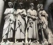 Andrew (holding his cross in the form of the letter X), James major (holding a pilgrims staff and a wallet), Thomas (holding a try square), Matthias (holding a spear)[50]