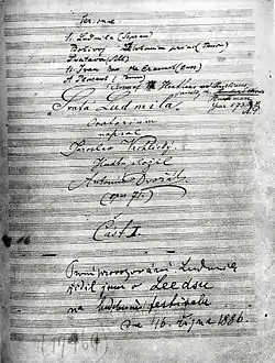 The title page of the autograph score of Dvořák's Saint Ludmila with inscription in the author's hand: "I conducted the first performance of ‘Saint Ludmila’ at the music festival in Leeds on October 16, 1886."[1] Nevertheless, the first performance took place on October 15, 1886. The note in the score is inaccurate.[2][3]