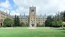 Designed by noted Indianapolis architect Evans Woollen III, the principal and founder of Woollen, Molzan and Partners,[12] the four-story, rectangular-shaped library was one of the five winners of the AIA/ALA Library Building Award for 1983. The 78,000-square-foot (7,200 m2) facility was designed to fit the specific setting and serves as the closing element to a secondary quadrangle of the college campus. Its modern design borrows shapes and colors from the surrounding buildings and includes a contemporary treatment of a Gothic building with a steeply-sloped roof, gables, a tower, dormers, and brick exterior. Study areas of various sizes are built around the interior perimeter; the library stacks are placed at the building's core. The library also includes a decorative tower that functions as a secondary building and houses offices, meetings rooms, a staff lounge, and storage space.[13] The library has a seating capacity of more than 540 and provides access to more than 268,000 books and audiovisual materials and more than 900 current print periodical subscriptions. The library also subscribes to more than 200 electronic periodical titles and numerous electronic indexes to journal articles.[14] The Huisking Instructional Technology Center is located on the lower level. Since 2016, the building has also come to house the ResNet (the student IT services), Accessibility Resources Office, the Writing & Tutoring Center, and the Student Success Program, creating a learning commons on campus. Dedicated in 1982, the building is named for Margaret Hall Cushwa (class of 1930) and Mary Lou Morris Leighton.