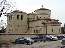 In 1676-1678, Prince Antonie Ruset, a distant relative of Caragea's, rebuilt the surrounding wall, of which the eastern part still survives. Archaeological excavations carried out in 1976-1979 found that the original church was quite similar to the second one, that the newer one was built further to the north and that both were used as burial grounds including over 300 graves. Research also determined that the area was used for ceramic production from the 15th century until shortly after 1500, when a powerful fire destroyed the workshop. Caragea died without descendants, and by the mid-17th century, the monastery was in the hands of the noble Palade family, with several of its members being buried on the site through the 19th century.[1] Three of their graves are in the vestibule; a fourth has an illegible inscription, but may belong to the architect Ianachi. It was the Palades who removed Caragea's grave, just as he had removed the graves of the 1583 founders. When the Peloponnesian archimandrite Grigore repaired the church in 1820, he left a plaque portraying himself as the sole ktitor. Such historical amnesia had the approval of the church, which benefited from substantial contributions in exchange for allowing donors to claim the status of founders.[2]