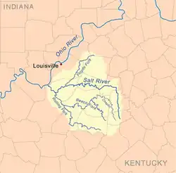 The Salt River is a 150-mile-long (240 km)[2] river in the U.S. state of Kentucky that drains 2,920 square miles (7,600 km2). It begins near Parksville, Kentucky, rising from the north slope of Persimmon Knob south of KY 300 between Alum Springs and Wilsonville, and ends at the Ohio River near West Point. Taylorsville Lake is formed from the Salt River, and Guist Creek Lake is also in its drainage basin.