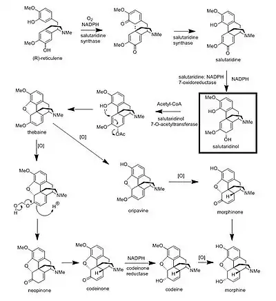 Salutaridinol can be converted in two reaction steps to the morphine precursor thebaine. The first step is an esterification of the hydroxyl group previously reduced in the conversion of salutaridine to salutaridinol with acetyl-CoA. This step is mediated by the enzyme salutaridinol 7-O-acetyltransferase. The second step is a ring closure achieved by a nucleophilic attack of the phenol group on the dienol system to generate an oxide bridge and kick out an acetate leaving group, giving thebaine.[10][11] This second step does not require an enzyme. Thebaine can then be converted to morphine through two slightly different biosynthetic routes, one of which makes use of the fourth enzyme codeinone reductase.[12][13]