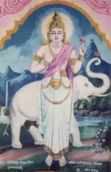Saman (also called Sumana, Sumana Saman, Sinhala: සුමන සමන් දෙවි) is a deity, subject to local and indigenous belief and worship in Sri Lanka. The name Saman means "good minded". His character is of historical significance for the Sinhalese people and veneration especially to all the Buddhists. Maha Sumana Saman Deviraja (Greater Lord of Gods Sumana Saman) is depicted crowned and bejeweled, holding a lotus flower in his right or left hand and accompanied by a white elephant.[1]