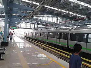 Mantri Square Sampige Road (formerly known as Sampige Road) is an important elevated metro station on the North-South corridor of the Green Line of Namma Metro serving the Malleswaram area of Bangalore, India. It was opened to the public on 1 March 2014.[1][2] The station was constructed by Mantri Developers and consists of two basements, one ground and one upper floor. The station was named Mantri Square Sampige Road due to a PPP agreement between the Bangalore Metro Rail Corporation Ltd (BMRCL) and Mantri.[3] Mantri Square is a shopping mall located near the station.[4]