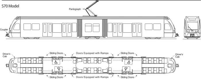 To enable the switch to a low-floor light rail vehicle (LRV) fleet, platforms at 35 stations would need to be raised from either ground level or sidewalk level (4-inch (102 mm)) to 6-inch (152 mm). Stations also needed a new "safety edge tile" with a smooth surface in the center to allow wheelchair ramps to deploy (the existing safety tile would stop ramps from fully deploying). The other complication of the switch to low-floor LRVs was that the traditional Siemens S70, like those ordered for the Green Line, were over 90 feet (27 m) long, so a three-car train would not fit within Downtown San Diego's 240 feet (73 m) blocks.[13] The MTS teamed up with the Utah Transit Authority, which faced a similar problem with its system. The solution for both agencies was a specialized design Siemens called the S70 US ("Ultra Short") which retains the low-floor design, but would be the same length as the older high-floor vehicles (80 feet (24 m)).[14]