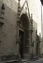Construction of the structure began in 1258, and the church was consecrated in 1371. The church has a Latin cross layout with three naves, divided by hexagonal pilasters. The tall hexagonal bell-tower near the apse was completed in the 15th century, and the copper-sheathed cupola (1548) and ribbed ceilings were not completed until the 16th century. The main facade is in a narrow alley, and has three portals, each with a peaked tympanum and thin elaborate pilasters. The central portal is decorated with highly sculpted travertine marble with a detached column with lions atop capitals, showing persisting Romanesque influences. The top of the tympanum has a sculpture of a lamb, a symbol of the guild of wool merchants, who patronized construction.[1]