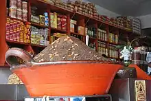 The community is best known for the preparation of mole, a traditional sauce that comes in a variety of flavors. Modern mole is derived from a pre-Hispanic preparation called "chilmulli," which in Nahuatl means "chili pepper sauce" During the colonial period, this sauce was modified mostly by adding ingredients such as nuts, peanuts, sesame seeds and spices such as cinnamon. While the flavors have multiplied and changed, the consistency of the sauce has remained the same.[1] Almost 92% of the community's population makes a living related to the preparation and sale of the sauce.[1] The moles of San Pedro Atocpan are not made in factories but rather in small family-owned enterprises.[6] Moles of different flavors, aromas, colors and textures are made, but the specialty is "mole almendrado" (almond mole), which was invented here and made with between 26 and 28 ingredients, always with a base of three chili peppers: mulato, pasilla and ancho. The recipe is well-guarded.[7] Many of these small businesses have networked to find ways to buy the more than twenty ingredients most moles need, such as chili peppers from Zacatecas, eliminating the need for middlemen. Each family in the town has its own recipes for the various types of moles. The family of Guadalupe Rios, for example, adds apple to her moles, presumably to avoid digestive problems.[1]